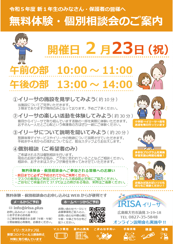 今年4月の小学校への進学を控え、療育を必要とするお子さんのことでお悩みを持たれている保護者の方も多いと思います。私たちIRISAで何かお力になれることがあればと思い、2023年2月23日(祝)に無料体験会・個別相談会を開催させていただきます。